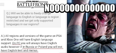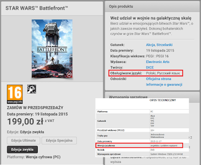 Może i nie należy to do najbystrzejszych spostrzeżeń, ale wczoraj dyskutując na ten temat na reddicie oraz sprawdzając ceny u sprzedawców w zachodniej części Europy doszedłem do pewnych wniosków. Prawdopodobnie widzieliście lub słyszeliście o rosyjskich kluczach. Czasami wystawiane są na serwisach aukcyjnych lub sprzedawane w sklepach z zaznaczeniem, że są przeznaczone jedynie na rynek wschodni (Rosja, Ukraina itd.) plus instrukcje jak język zmienić na angielski. Mimo że wcześniej do mnie to nie dotarło, ale teraz zdałem sobie z tego sprawę. Polska jest dokładnie w taki sam sposób potraktowana jak wschód. Mamy klucze przeznaczone wyłącznie na nasz region. W takim razie czemu w oficjalnym sklepie Origin nie ma oznaczenia (PL) tak jak jest to w przypadku naszych wschodnich sąsiadów? Porównajcie cenę gry Star Wars Battlefront w sklepach w Polsce, możemy kupić już za ok. 160 zł (cena 199 zł w Origin to nieśmieszny żart), a cena za granicą? 60€ to cena oficjalna, w przeliczeniu na złotówki daje nam ok 250 zł. Jak na grę na komputery stacjonarne to ogromnie dużo, nie jesteśmy przyzwyczajeni do takich kwot, dlatego u nas by to nie przeszło. Aby nie szokować przeciętnego polskiego gracza, powstała tańsza wersja na nasz rynek za 2/3 ceny. Electronic Arts musiało 'wyciąć’ oryginalną wersję językowym w celu powstrzymania odsprzedaży tańszych kopii w innych regionach na świecie.Podsumowując, na platformie Origin dla Europy występują następujące wersje gry: EU (Angielski, Francuski, Niemiecki, Włoski, Hiszpański), PL (Polski, Rosyjski), RU (Rosyjski). Jest jeszcze wersja Globalna, która zmienia język gry zależnie od ustawień klienta Origin, jeżeli wspiera dany język (wersje testowe są wersjami Global). Wszystko to powoduję ogromny zamęt i najbardziej zaskakuję mnie fakt, że Electronic Arts niespecjalnie informuję o takim stanie rzeczy. Już na Reddicie spotkałem osobę, która nie zdawała sobie sprawy z tego, że pre-orderował grę w wersji polskiej.